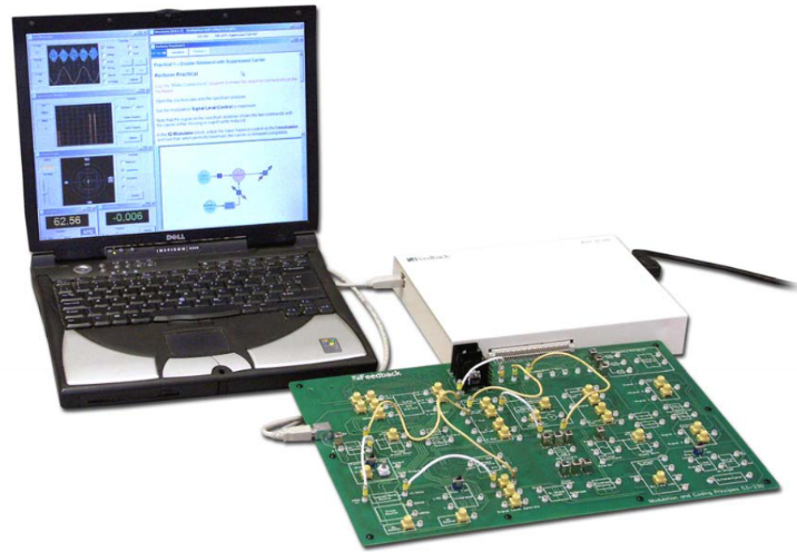 نستخدم في هذا المخبر تجهيزات عتادية من شركة Feedback® والتي تتكامل مع مجموعة من البرمجيات التي تم تنزيلها على حواسب المخبر. كما تضمن المخبر جميع التسهيلات الضرورية لتنفيذ تجارب الاتصالات والتي تسمح للطلاب المهتمين لإجراء المزيد من الاختبارات عند الضرورة.