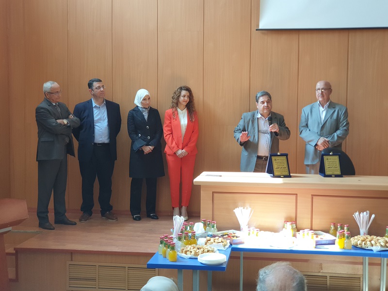 حيث قام رئيس الجامعة الأستاذ الدكتور تامر الحجة وأسرة كلية الصيدلة ممثلةً بالعميدة الدكتورة عفراء النقري بتسليم دروع تكريم للدكتور محمد ماهر القطيني و الدكتور مروان الزبيبي، بحضور عدد من الأساتذة الضيوف وأعضاء الهيئة التدريسية والإدارية في كلية الصيدلة.