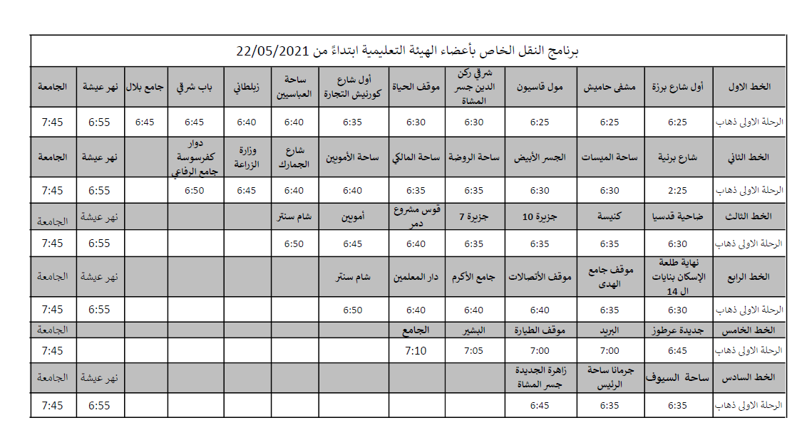 | برنامج النقل الخاص بأعضاء الهيئة التعليمية ابتداءً من 22/05/2021 | ||||||||||||