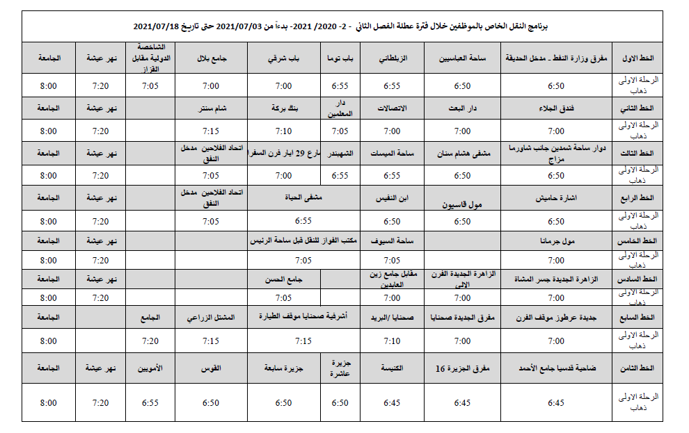 | برنامج النقل الخاص بالموظفين خلال فترة عطلة الفصل الثاني - 2- 2020/ 2021- بدءاً من 2021/07/03 حتى تاريخ 2021/07/18 | |||||||||