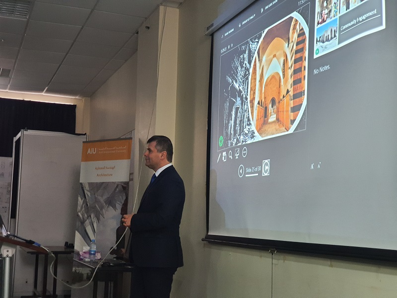 In the presence of the President of the Arab International University and the administration of the College of Architecture represented by the Dean of the College and the two Administrative and Scientific Deputies, and with the distinguished participation of the faculty and students of the College of Architecture, Dr. Ali Ismail gave a valuable lecture on the research and application strategies and methodologies adopted by the Aga Khan Foundation in the rehabilitation of damaged archaeological sites in The city of Aleppo: a case study, Al-Saqatiyah Market, as the first restored market in which the Foundation won the Ichrome Prize for Heritage in Sharjah, where he spoke with a lot of passion mixed with optimism and hope about the institution's unique experience in the process of restoring and rehabilitating Al-Saqatiyah market, starting with assessing the damages and parts. Destroyer, using the latest technologies and assistive tools, leading to the development of strategies centered on preserving the human and cultural heritage and work methodologies targeting people and their needs as a fundamental goal in achieving development, and finally by emphasizing the importance of the participation of the local community as a key actor for the success of any project.